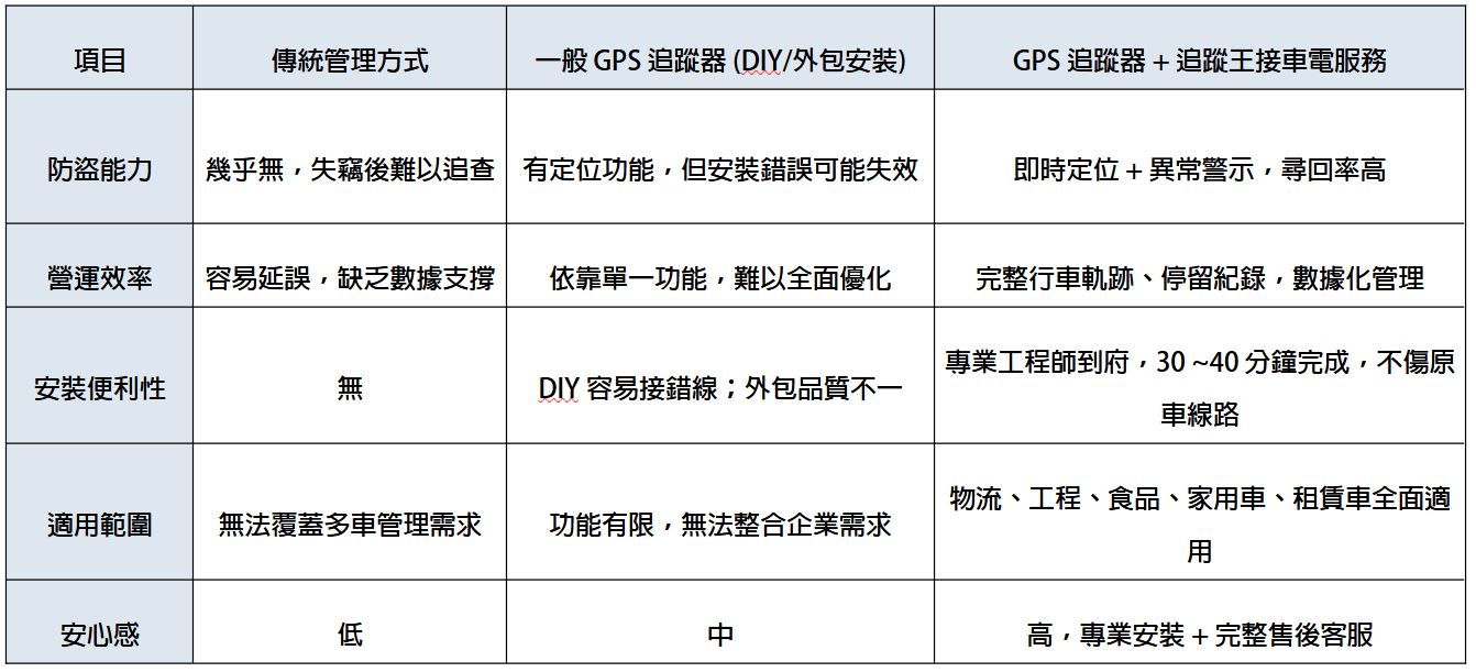 比較表:傳統車輛管理 vs GPS 追蹤器 + 追蹤王接車電服務