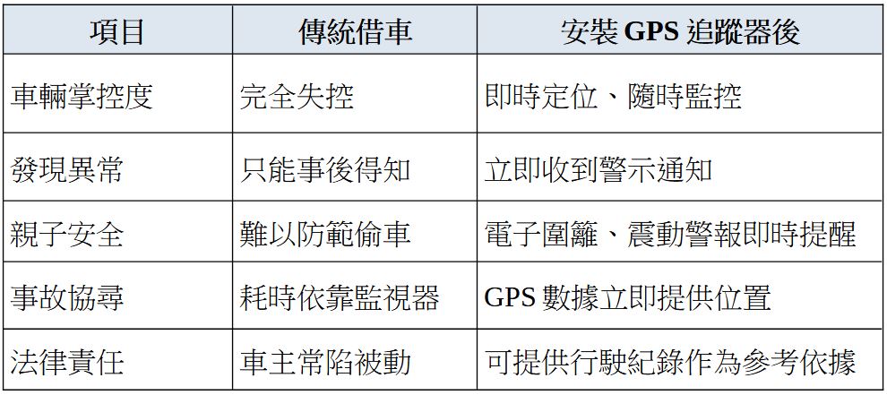 比較表:傳統借車 vs. 安裝GPS追蹤器