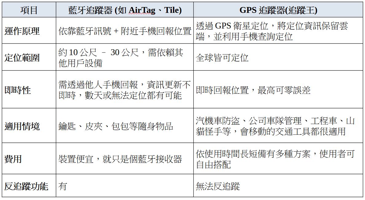 藍牙防丟器 vs GPS追蹤器比較表