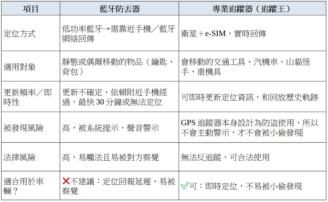從表格可以看到,若你把藍牙防丟器放在汽車底盤、機車尾箱、車內隱蔽處,期望長時間追蹤車輛動態,技術上是不穩定的:可能因為車輛移動範圍大、靠近手機的機會少,使得裝置無法及時回傳位置;更重要的是,被追蹤者很可能會收到警示通知。