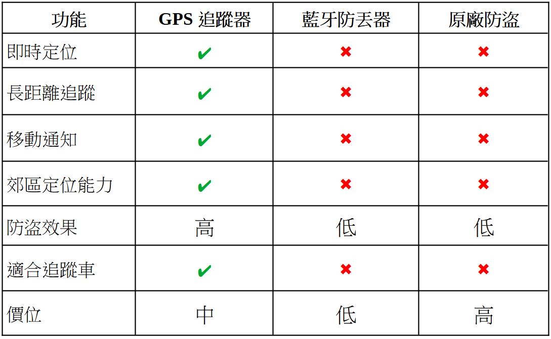 六、比較表:GPS vs 藍牙 vs 原廠防盜