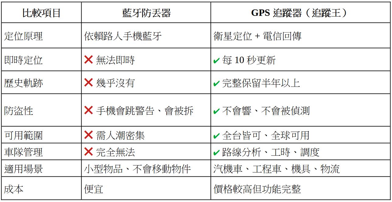 藍牙防丟器 vs GPS 追蹤器 比較表(全新版本)