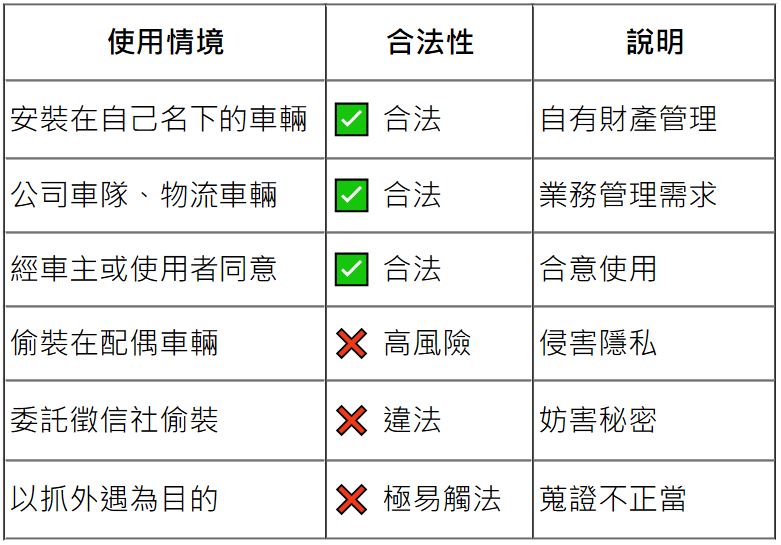 只要裝在自己擁有的車輛或資產,或經當事人同意,屬於合法使用。